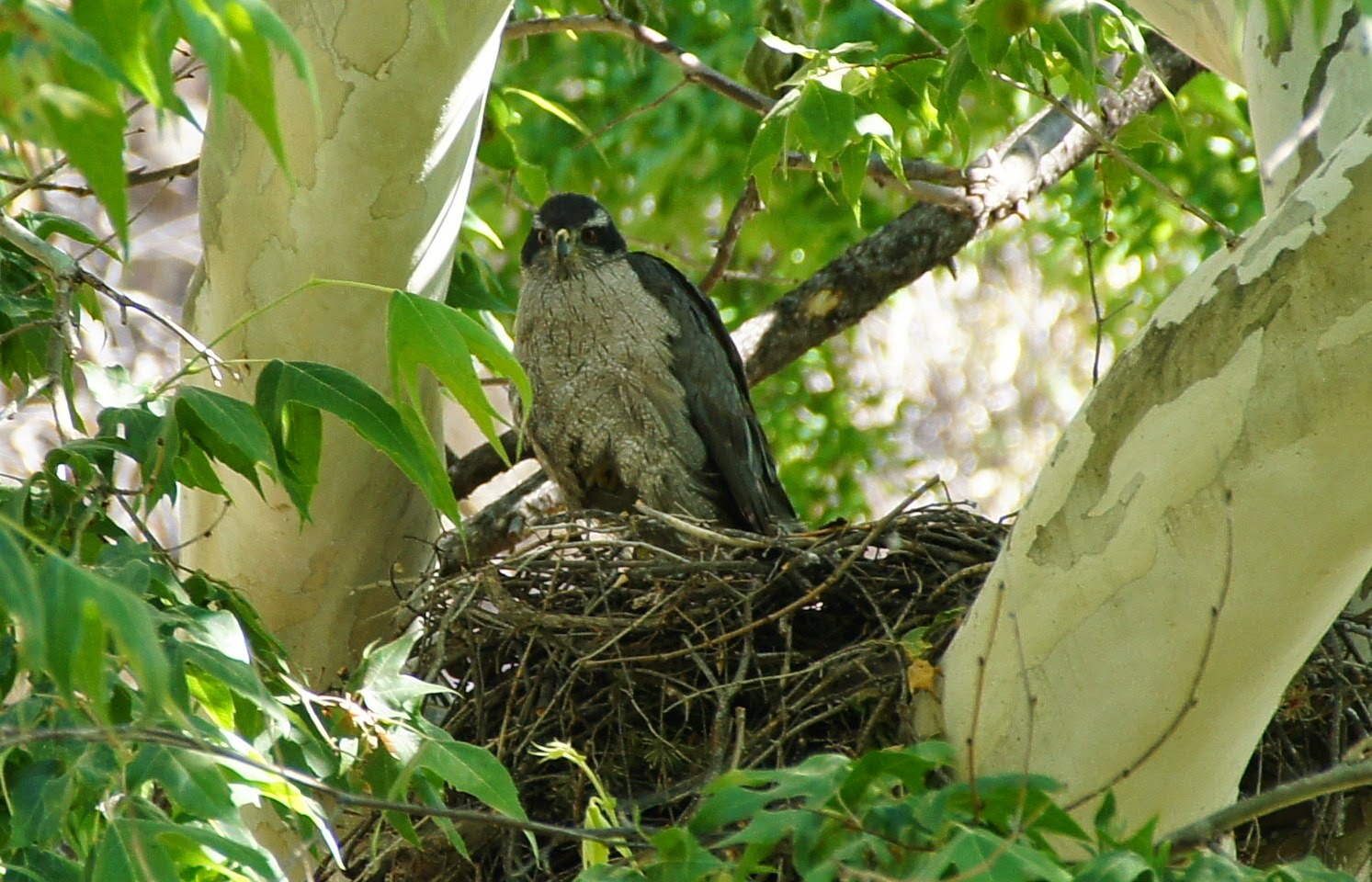 This is a Northern Goshawk female sitting with her unseen chicks in Miller Canyon.  She is peeking over the edge of her nest nestled in a sycamore tree along the canyon.  This is an example of how Miller Canyon makes life very easy for birders.  Along this trail, this active Northern Goshawk nest can be seen well from the trail.  It is place a considerable distance away from the trail as well, but it is far enough away from the trail that the Northern Goshawks who reside in this nest don't show their usual and highly aggressive nature to humans.  During the nesting season, this female Goshawk usually sits on the nest and the best views are usually similar to the picture above.  The male will bring her meals throughout the day, but it is very hit-or-miss to see it take place.  Magill and I even got a glimpse of the male flying over the canyon, starting off his long day of hunting for his mate.  As Magill, Andre, George and I walked up to the area of the nest after a steep climb, the female Goshawk was in the nest, but wasn't showing very well.  And for her not to be a NOGO, she needed to stand on the side of the nest, which I also read that she was starting to do.  Things started off very slow, and she didn't move much.  George did have a nice scope with him, and that resulted in killer head views of the Northern Goshawk.  I even climbed up from the trail a little bit to see if I could get a more elevated view of the nest, but that didn't work out so well either.